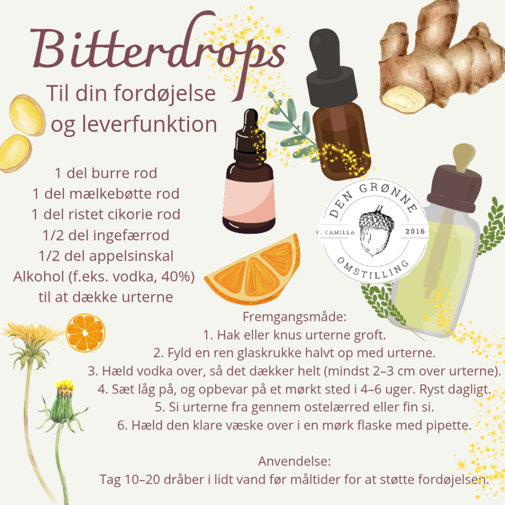 Bitterdrops er små mængder koncentreret tinktur lavet af bitre urter – et virkelig godt og sundt tilskud at have i sit lager. Det kan holde sig i 10-15 år hvis det opbevares korrekt.