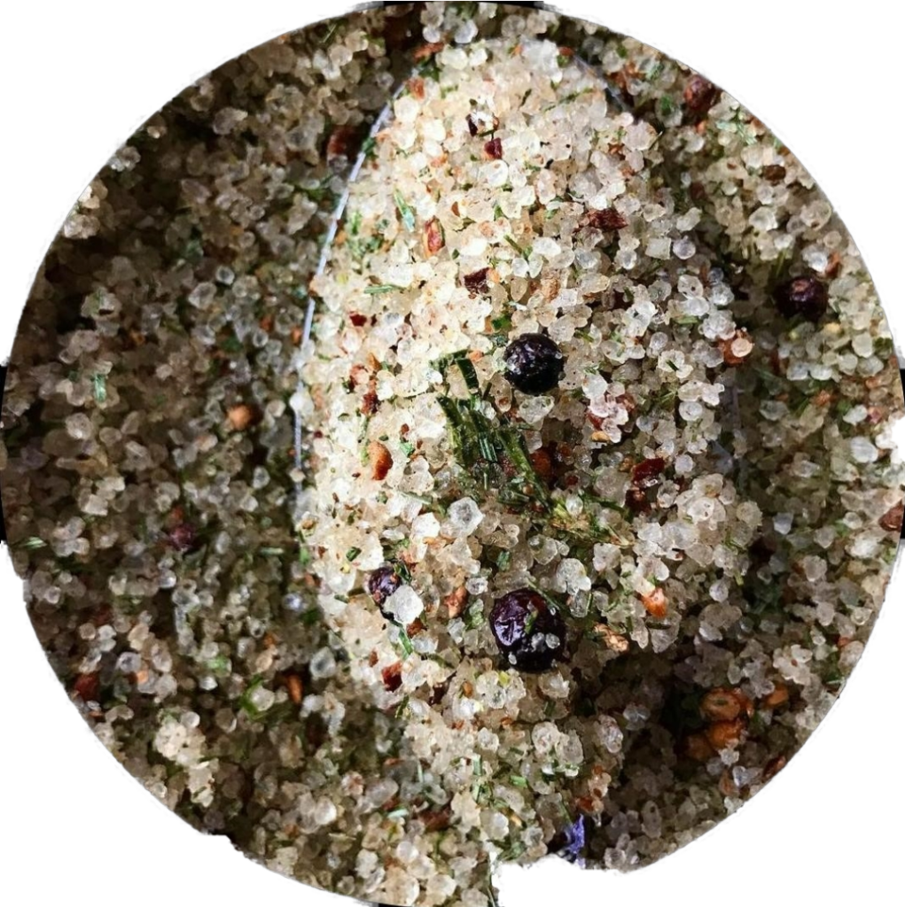 - Bland havsalt, grannåle og enebær i en skål. Du kan eventuelt kværne det let i en morter for at frigive mere duft.